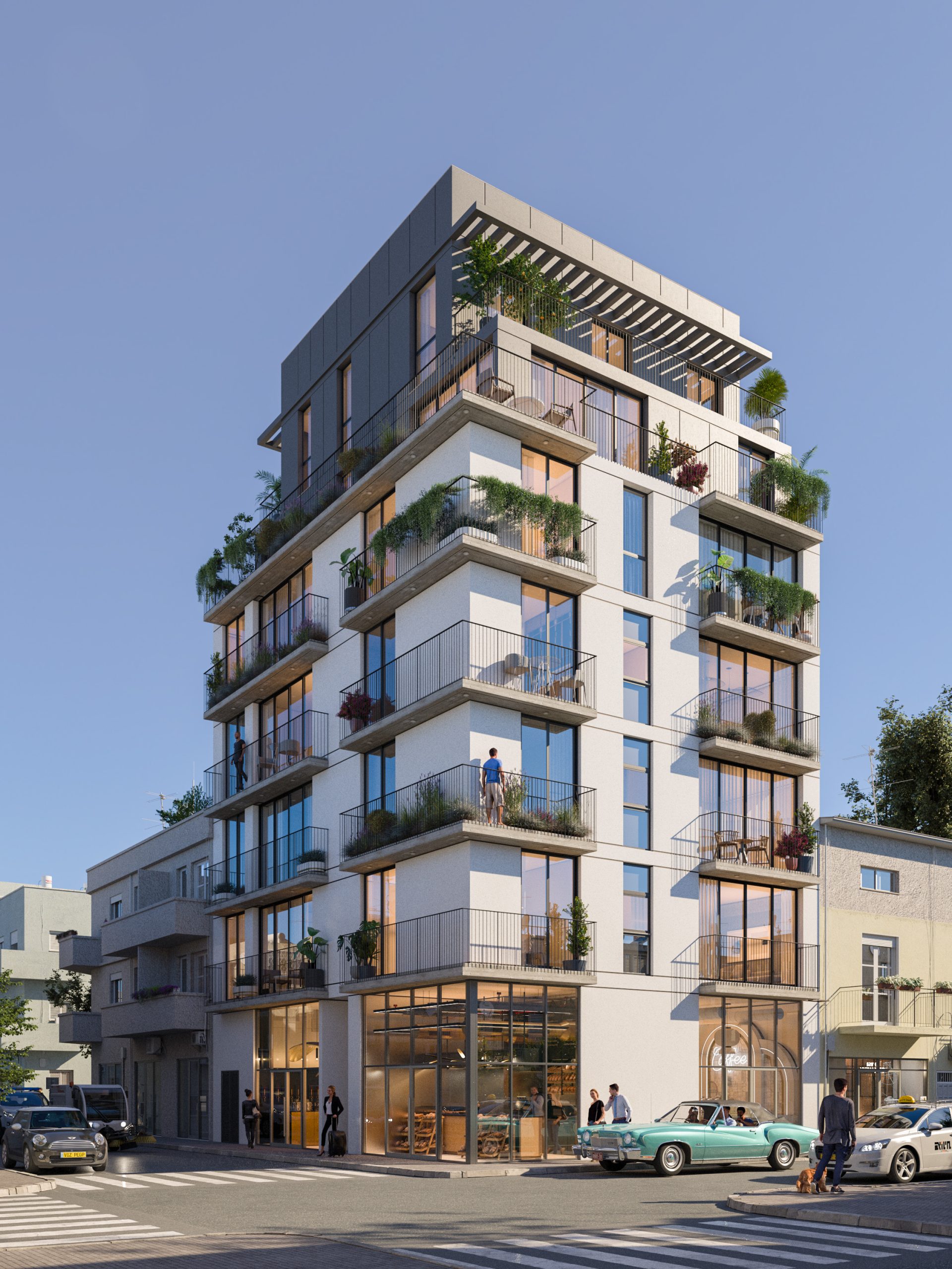 L’immeuble se compose de sept étages, avec un rez-de-chaussée commercial surmonté de niveaux résidentiels, pour un total de treize appartements בלבד. L’architecture contemporaine s’intègre harmonieusement à l’identité du quartier. Le projet est développé par un promoteur et constructeur actif depuis plus de quarante ans à Tel Aviv, avec un accompagnement bancaire assuré par une grande banque israélienne.
